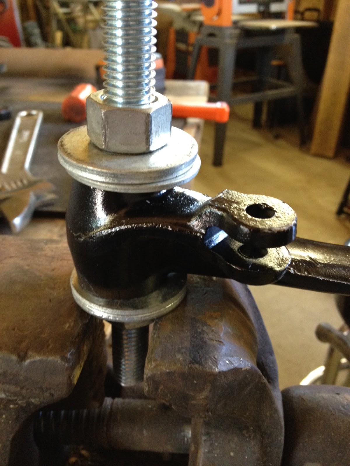 Installed new king pins and bushings. The new bushings are built larger than the king pin diameter to allow for machining to a perfect fit. I had to take the spindles to a local machine shop to ream out the bushings. Added the brake backer plates. 2/8/2012.